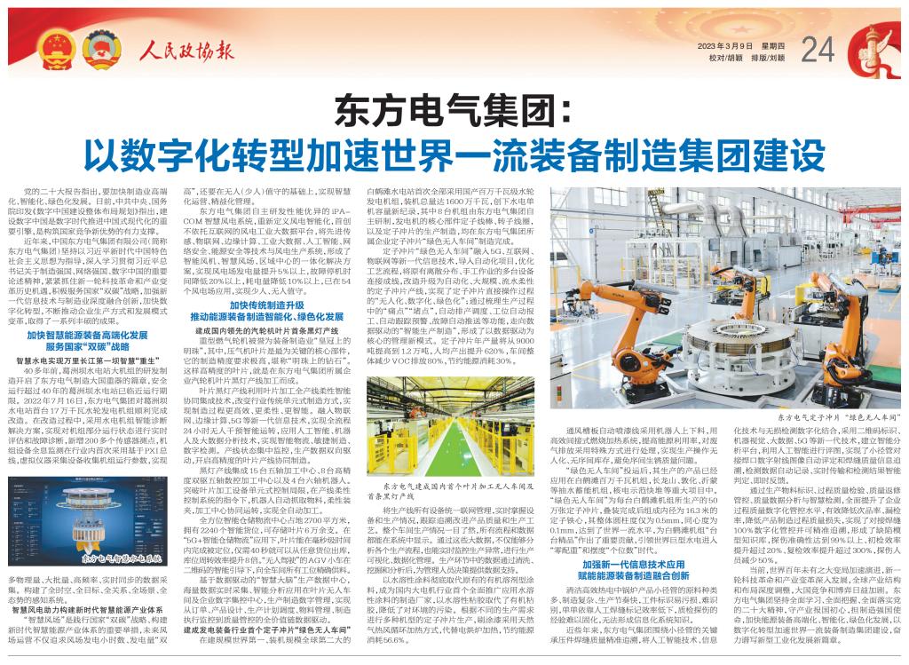 当前,世界百年未有之大变局加速演进,新一轮科技革命和产业变革深入发展,全球产业结构和布局深度调整,大国竞争和博弈日益加剧。东方电气集团坚持全面学习、全面把握、全面落实党的二十大精神,守产业报国初心,担制造强国使命,加快能源装备高端化、智能化、绿色化发展,以数字化转型加速世界一流装备制造集团建设,奋力谱写新型工业化发展新篇章。