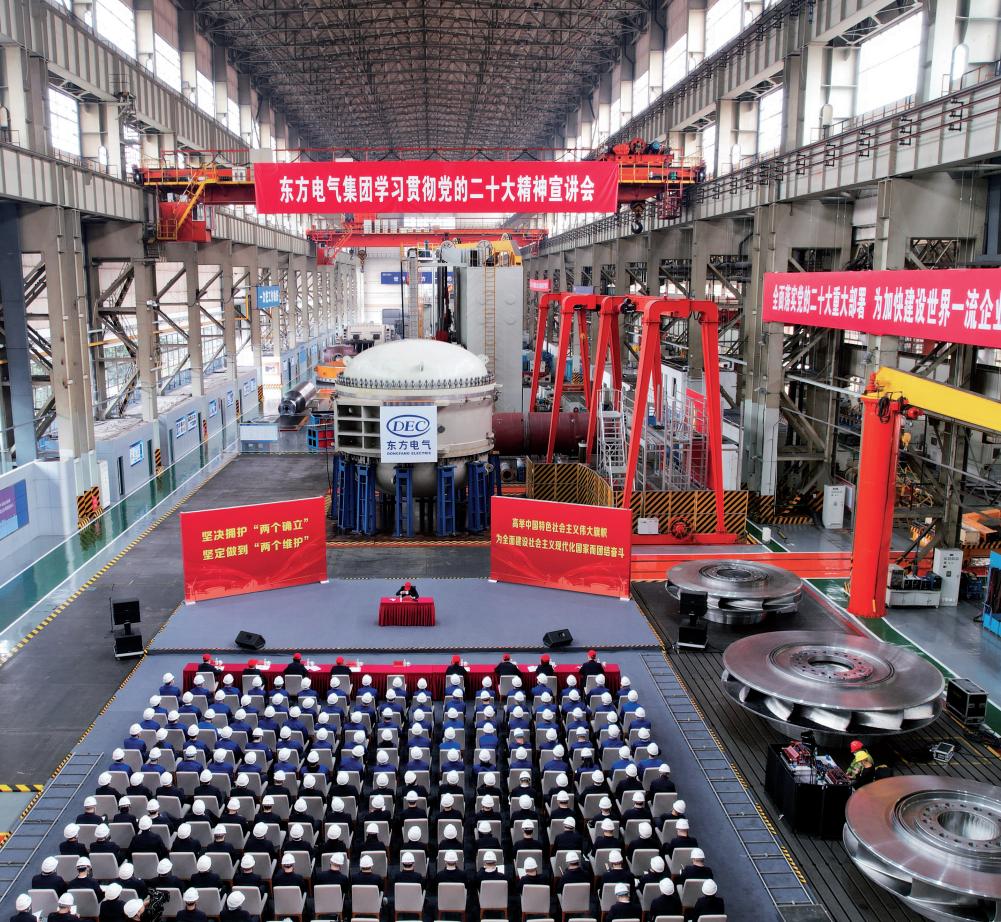 红色东方,一心向党。东方电气集团各级党组织和广大党员深入学习贯彻党的二十大精神,深刻领悟“两个确立”的决定性意义,增强“四个意识”、坚定“四个自信”、做到“两个维护”,以“东方心”党建品牌为引领,争当忠诚担当的排头兵,心怀“国之大者”,勇担“国之重器”,以科技强国、制造强国的实际行动彰显初心使命,以攻坚克难、勇攀高峰的出色业绩擦亮党员底色,坚决捍卫“两个确立”,时刻对党绝对忠诚。争当勇于创新的领头雁,敢为人先打造原创技术“策源地”和现代产业链“链长”,主动担当转型跨越的开路先锋、攻坚克难的中流砥柱,把党的政治优势、组织优势转化为竞争优势、发展优势,形成建设世界一流企业的强大力量。争当勠力同心的主力军,传承伟大建党精神,弘扬“东汽精神”,践行“同·创”文化,把每个团员青年、统战成员、职工群众团结在党组织周围,凝聚起全集团两万多名党员干部职工合力,同心、同力、同行,共同奔赴集团公司全面领先、争创一流、高质量发展的新征途。