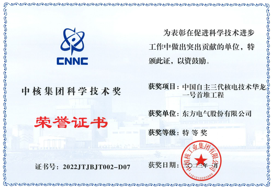 华龙一号全球首堆示范工程中核集团福清5、6号机组分别于2021年1月30日、2022年3月25日在福清核电厂投入商业运行,机组额定出力超过合同保证值,各项关键设计参数均满足设计要求,总体技术达到世界先进水平。鉴于在“中国自主三代核电技术华龙一号首堆工程”研发和供货工作中的突出贡献,近日,东方电气荣获中核集团科学技术奖特等奖。