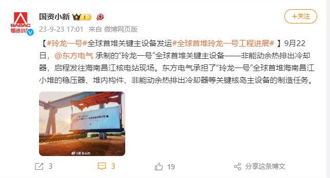 [国资小新]#玲龙一号#全球首堆关键主设备发运#全球首堆玲龙一号工程进展#