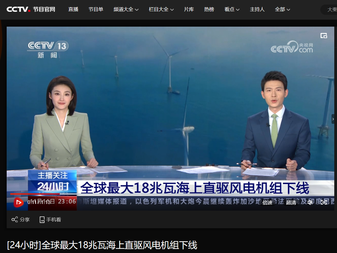 [央广网]突破关键核心技术壁垒!全球最大18兆瓦海上直驱风电机组下线