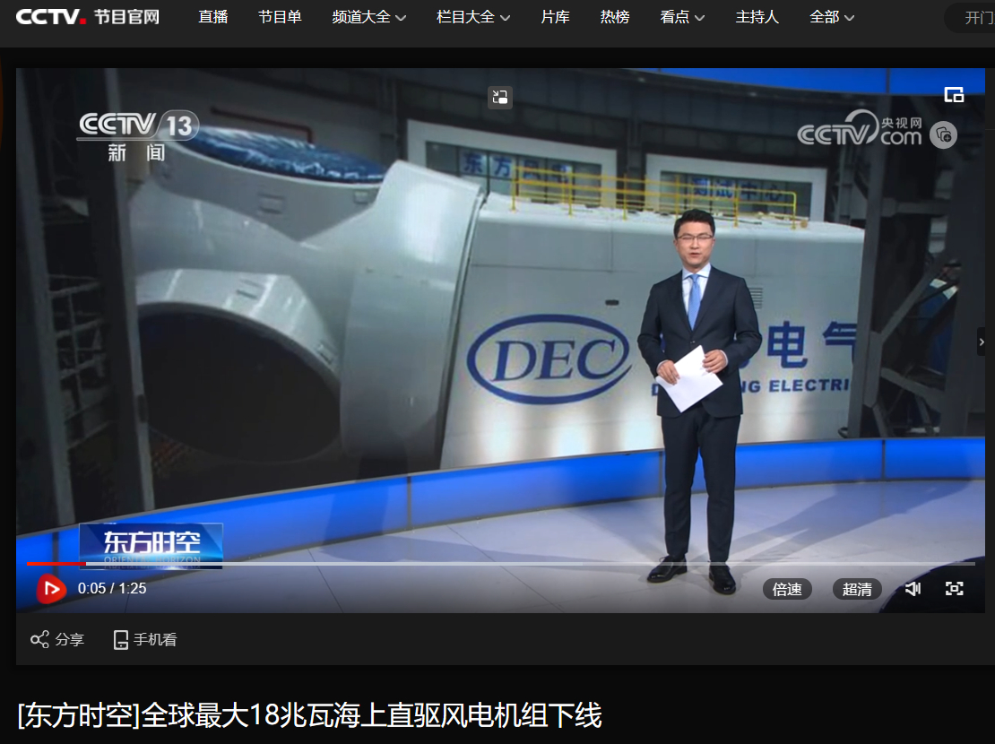 [央视东方时空]全球最大18兆瓦海上直驱风电机组下线