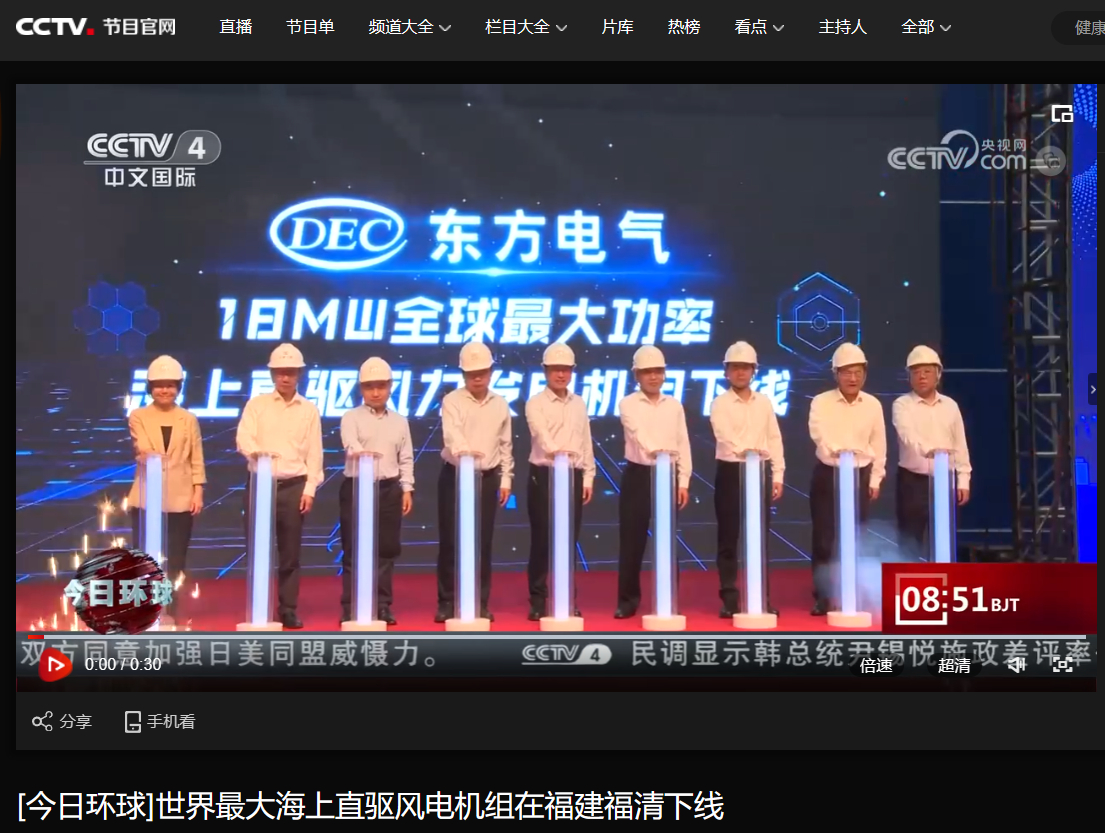 [央视今日环球]世界最大海上直驱风电机组在福建福清下线