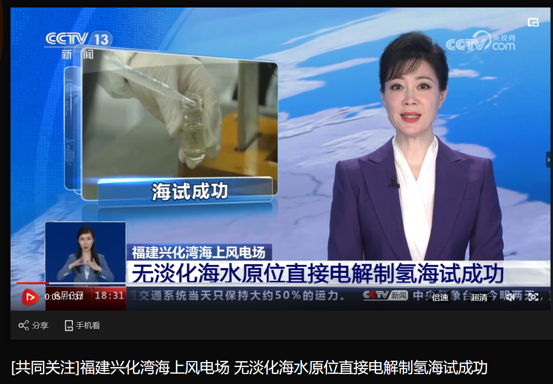 [央视共同关注]福建兴化湾海上风电场 无淡化海水原位直接电解制氢海试成功