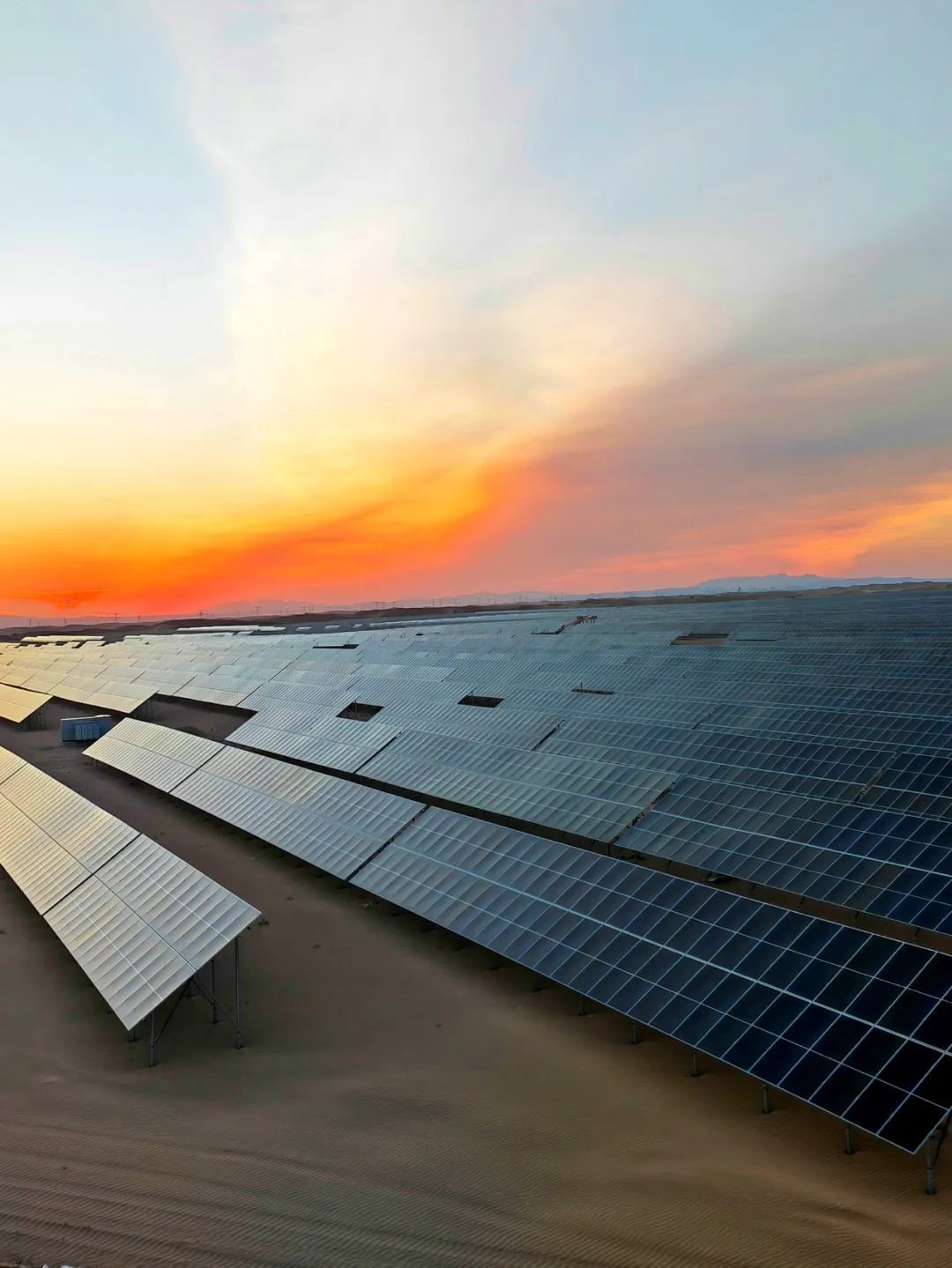 沙漠里的光伏发电:作为国家“十四五”首批大基地风光项目之一,东方电气旗下东方自控EPC总承包甘肃华电九墩滩20万千瓦光伏项目。项目以“板上发电、板下治沙”的方式,将太阳能开发与腾格里沙漠治理有机结合,在光伏板下栽植沙生植物,不仅起到防风固沙的作用,也为发展“板下农牧业”等奠定了基础,在未来几年内,助力实现黄沙变“蓝海”、沙漠变“绿洲”,全力绘就腾格里沙漠里的“生态绿”。