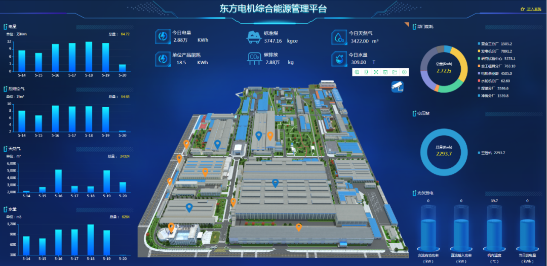 东方电机厂区综合能源示范项目:安全健康,环境友好。东方电气旗下东方电机厂区综合能源示范项目,结合综合能源规划技术,基于所在地域的可再生资源、外供能源、园区用能情况建成。由综合能源管理平台、燃机发电及余热利用、储能系统、光伏发电、充电桩、雨水回收系统、空压站、地源热泵八大子系统组成,每年可节约能源折合标煤约800吨,减少碳排放约4000吨,有良好的节能减排效果。