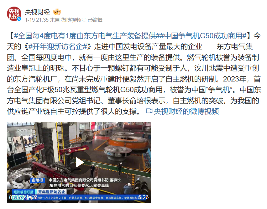 【#全国每4度电有1度由东方电气生产装备提供##中国争气机G50成功商用#】今天的《#开年迎新访名企#》走进中国发电设备产量最大的企业——东方电气集团。全国每四度电中,就有一度由这里生产的装备提供。燃气轮机被誉为装备制造业皇冠上的明珠。不甘心于一颗螺钉都有可能受制于人,汶川地震中遭受重创的东方汽轮机厂,在尚未完成重建时便毅然开启了自主燃机的研制。2023年,首台全国产化F级50兆瓦重型燃气轮机G50成功商用,被誉为中国“争气机”。星空官方入口党组书记、董事长俞培根表示,自主燃机的突破,为我国的供应链产业链自主可控提供了很大的支撑。