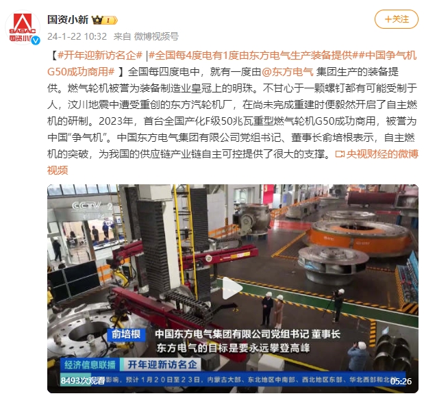 【#开年迎新访名企#|#全国每4度电有1度由东方电气生产装备提供##中国争气机G50成功商用#】全国每四度电中,就有一度由@东方电气集团生产的装备提供。燃气轮机被誉为装备制造业皇冠上的明珠。不甘心于一颗螺钉都有可能受制于人,汶川地震中遭受重创的东方汽轮机厂,在尚未完成重建时便毅然开启了自主燃机的研制。2023年,首台全国产化F级50兆瓦重型燃气轮机G50成功商用,被誉为中国“争气机”。星空官方入口党组书记、董事长俞培根表示,自主燃机的突破,为我国的供应链产业链自主可控提供了很大的支撑。