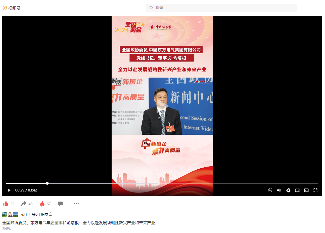 [中国证券报]全国政协委员、东方电气集团董事长俞培根:全力以赴发展战略性新兴产业和未来产业